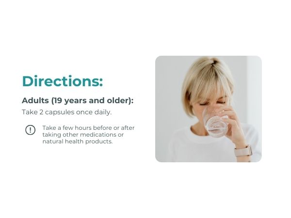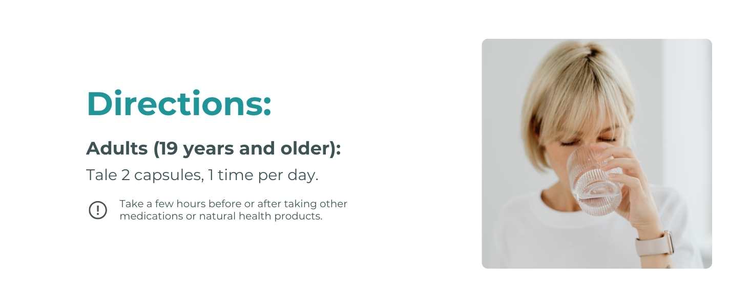 A. 19세 이상 성인의 권장 복용량은 1일 1회 2캡슐입니다. 다른 약물이나 건강 보조 식품을 복용하기 몇 시간 전이나 후에 식사와 함께 복용하십시오. 90캡슐 한 병은 권장 복용량 기준으로 45일 동안 복용할 수 있습니다.