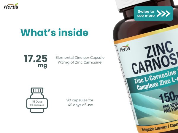 A. 허바 아연 카르노신 캡슐 하나에는 75mg의 L-카르노신 아연(폴라프레진크)이 함유되어 있으며, 이는 17.25mg의 순수 아연을 제공합니다. 권장 섭취량은 하루 2캡슐이며, 이를 통해 총 150mg의 아연 카르노신 복합체와 34.5mg의 순수 아연을 하루 동안 섭취할 수 있습니다. 이는 시중의 다른 많은 브랜드보다 순수 아연 함량이 약 8% 더 높은 수치입니다.